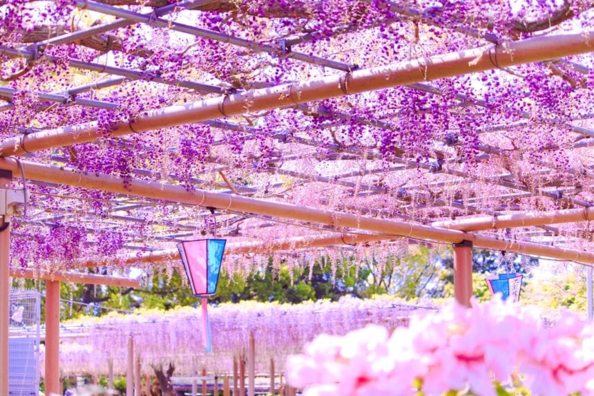 4月中旬から5月上旬にかけて、早咲きから遅咲きまで11種類60本の美しい藤の花が咲く名所として知られています。