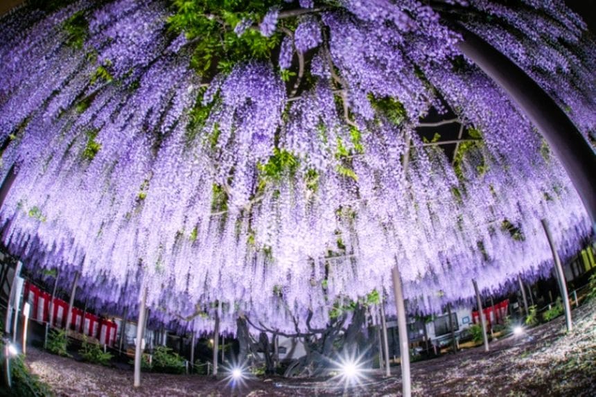 4月中旬から5月上旬にかけて見頃を迎え、「美濃竹鼻ふじまつり」が開催され、夜には幻想的なライトアップも実施されます。