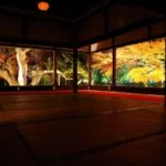 瑠璃光院の夜間拝観では、ライトアップされた紅葉が幻想的な雰囲気を醸し出します。